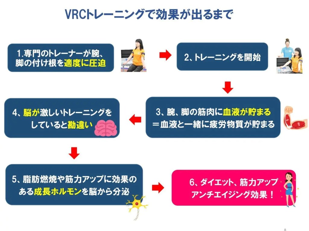 VRC(BFR)加圧トレーニングでは15分程度の短時間で筋力強化や筋肥大効果、成長ホルモンやアドレナリンの大量分泌による体脂肪燃焼効果が認められています。また成長ホルモンの分泌はトレーニング後24~48時間に渡って続くため体脂肪をためにくい太りにくいカラダを作ることが出来ます。